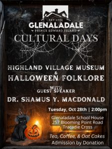 Glenaladale Heritage Trust invites you to the continuation of its Scottish Cultural Days, with Guest Speaker, Dr. Shamus Y. MacDonald, Manager of Culture and Language at the Highland Village Museum, Iona, Cape Breton. He will speak on the Highland Village history as well as take us through some historic accounts of early death and mourning practices in P.E.I. and Nova Scotia, in the spirit of Halloween. Shamus is also well versed in the meaning of land to the early settlers.